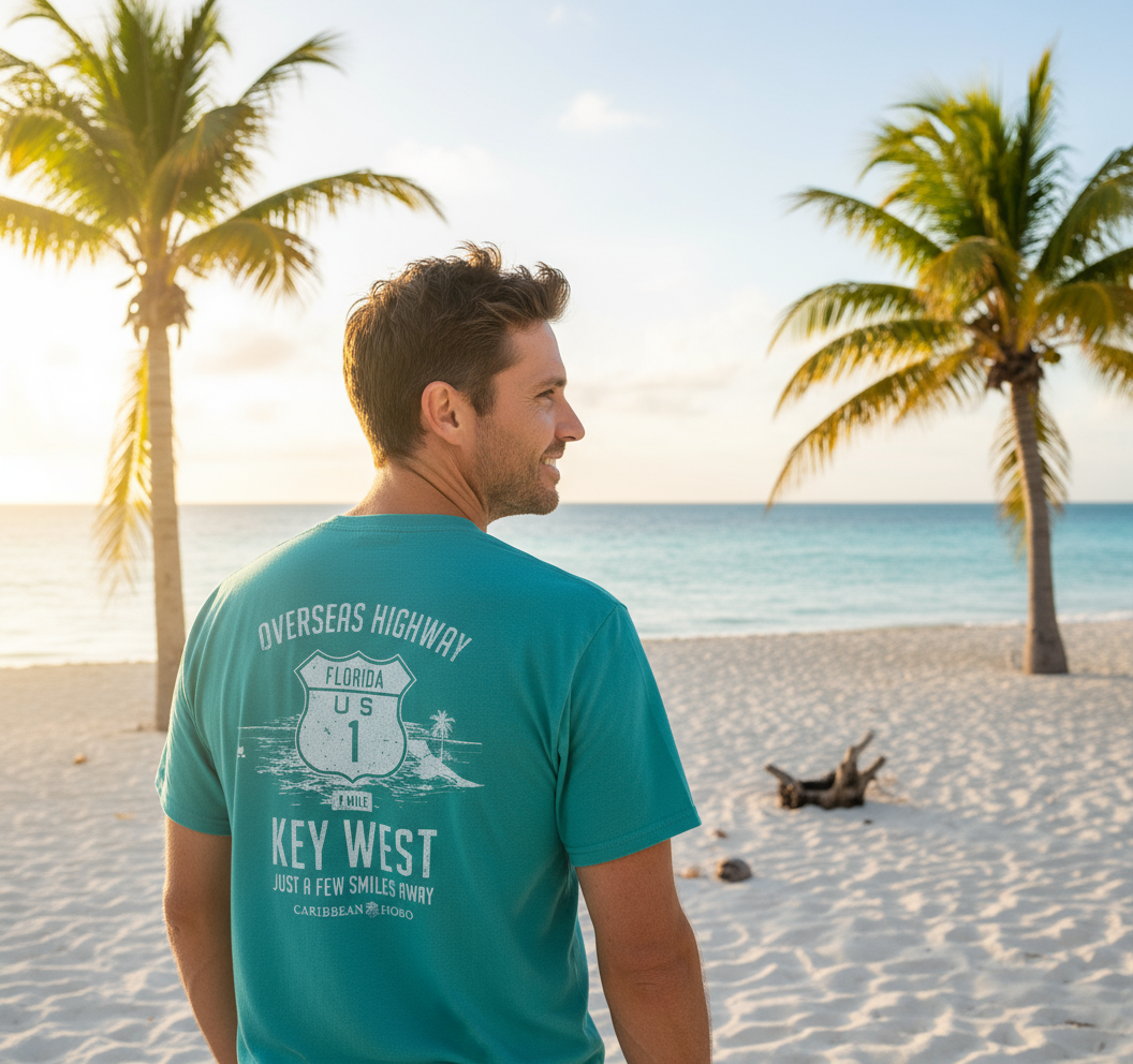 Overseas Highway.....Just a few smiles away. The shirt is 100% ring spun cotton. The design is screen printed on the back with our logo over the heart. When you're cruising on the overseas highway on the 7 mile bridge, you're only a few smiles away from the Fatherland. '